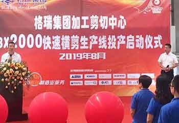 2019-08-192019年08月16日上午,格瑞集團加工中心3*2米快速開平線投產(chǎn)開機儀式在加工中心車間隆重召開,格瑞集團總經(jīng)理助理馮國棟宣布儀式開始,龐宏董事長發(fā)表講話并致辭。